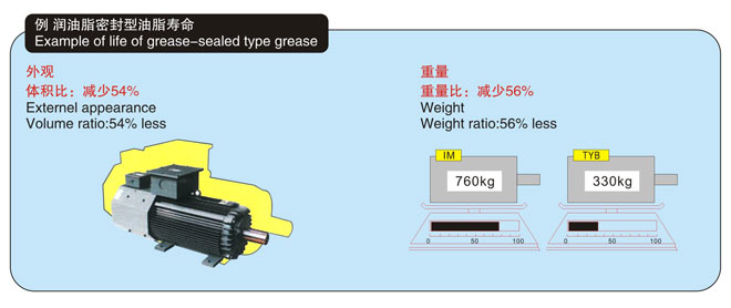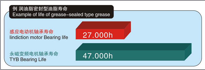 因為轉(zhuǎn)子幾乎不發(fā)生損失,所以軸承溫度較低,密封油脂壽命大約延長至本公司YVF2系列變頻器專用IM的1.5-2倍(約32,000-47,000 Hr),可減輕維護工作。