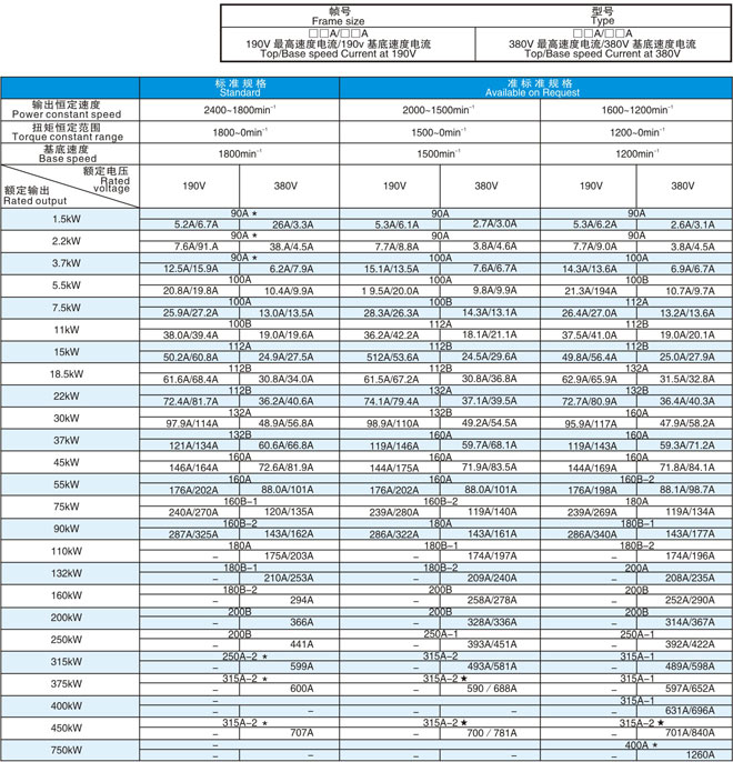 注1) 315kW 375kW 450kW以及750kW中,*標記只表示恒轉(zhuǎn)矩控制。但是,如果容A從750kW降低到700kW,則可適用于電機轉(zhuǎn)速范圍1500~1200min-1。 (700kW 1500/1200 min-1 1101/1170A)