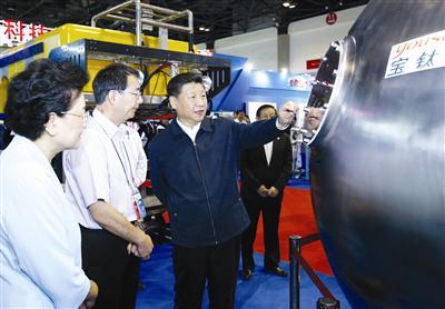 新華社照片,北京,2016年6月3日,中共中央總書記、國家主席、中央軍委主席習(xí)近平在北京展覽館參觀國家“十二五”科技創(chuàng)新成就展時,在寶鈦集團生產(chǎn)的4500米深潛器球殼前駐足了解情況,并給予高度評價。 新華社記者 鞠鵬 攝