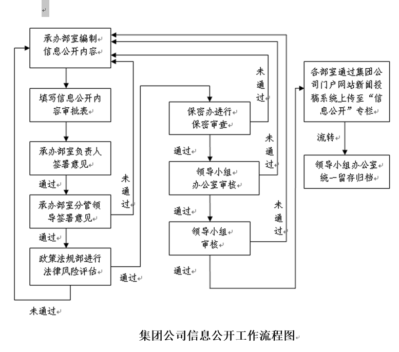 信息內容審核。集團公司各部室編制完成相關信息內容后,及時填寫《集團公司信息公開審批表》(附件),報送政策法規部進行法律風險評估,隨后提交保密辦進行保密審查,并履行領導小組審核程序。