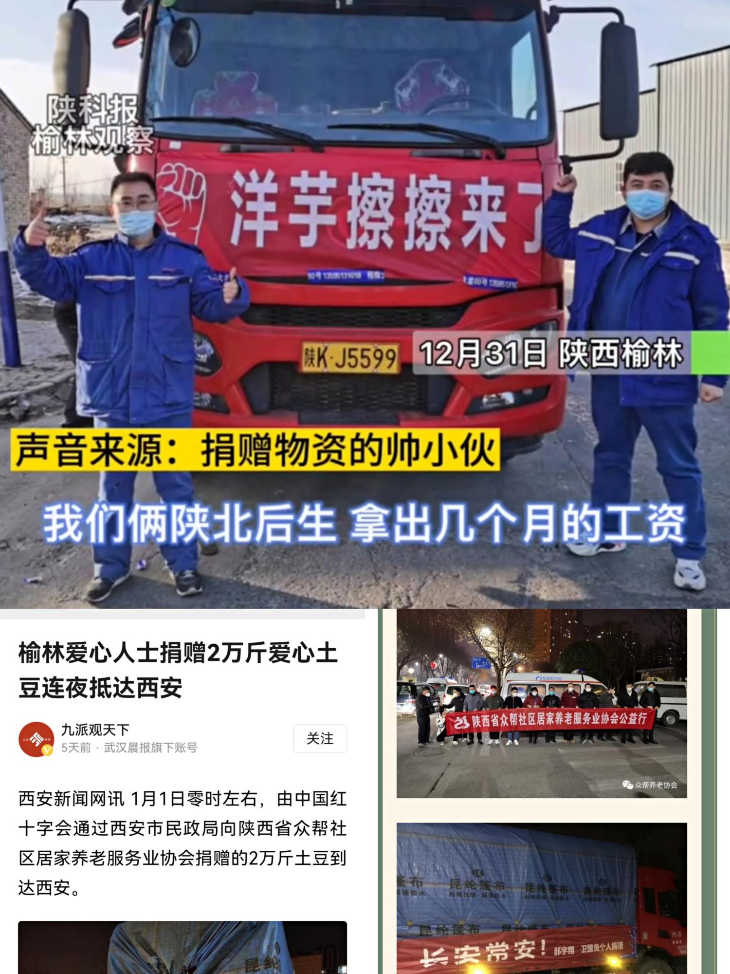 一方有難,八方支援。2021年12月31日,陜西有色榆林新材料集團鋁業分公司青年職工郝宇翔、衛國良通過中國紅十字會向西安捐贈2萬斤土豆。在這個特殊時期,用自己的方式傳遞著守望相助的愛心與決心。為了這2萬斤土豆郝宇翔和衛國良專程驅車趕往榆林靖邊的土豆種植基地采買土豆。郝宇翔說,“我們兩個就是拿出幾個月的工資,本著要捐就捐最好的原則,特別挑了靖邊沙地黃心土豆,希望能幫助到更多地親人們渡過難關。”在聯系運輸車輛的時候遇到重重困難,正值元旦假期前,運輸車輛較少且運費貴。他們沒有為困難退卻,經過兩天多的多方打聽、努力找尋,終于才聯系到了合適的運輸車輛。我問他為什么那么堅持,很多人可能也有心去捐贈,但苦于無門,或者會為各種困難而放棄。衛國良說,“這么多年的工作性質養成的習慣,決定做了就必須做到,不到最后一刻,就要全力以赴”。