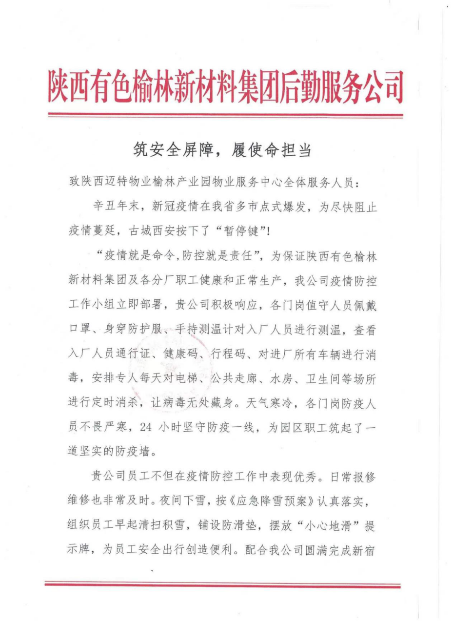 新材料后勤服務公司的致謝,是對園區物業服務工作的肯定,也是對物業員工的鼓舞。邁特物業員工紛紛表示:有付出就有收獲,將更加細化物業服務工作,進一步提高服務品質,為榆林新材料職工創造舒適、安全、美好的生活環境。