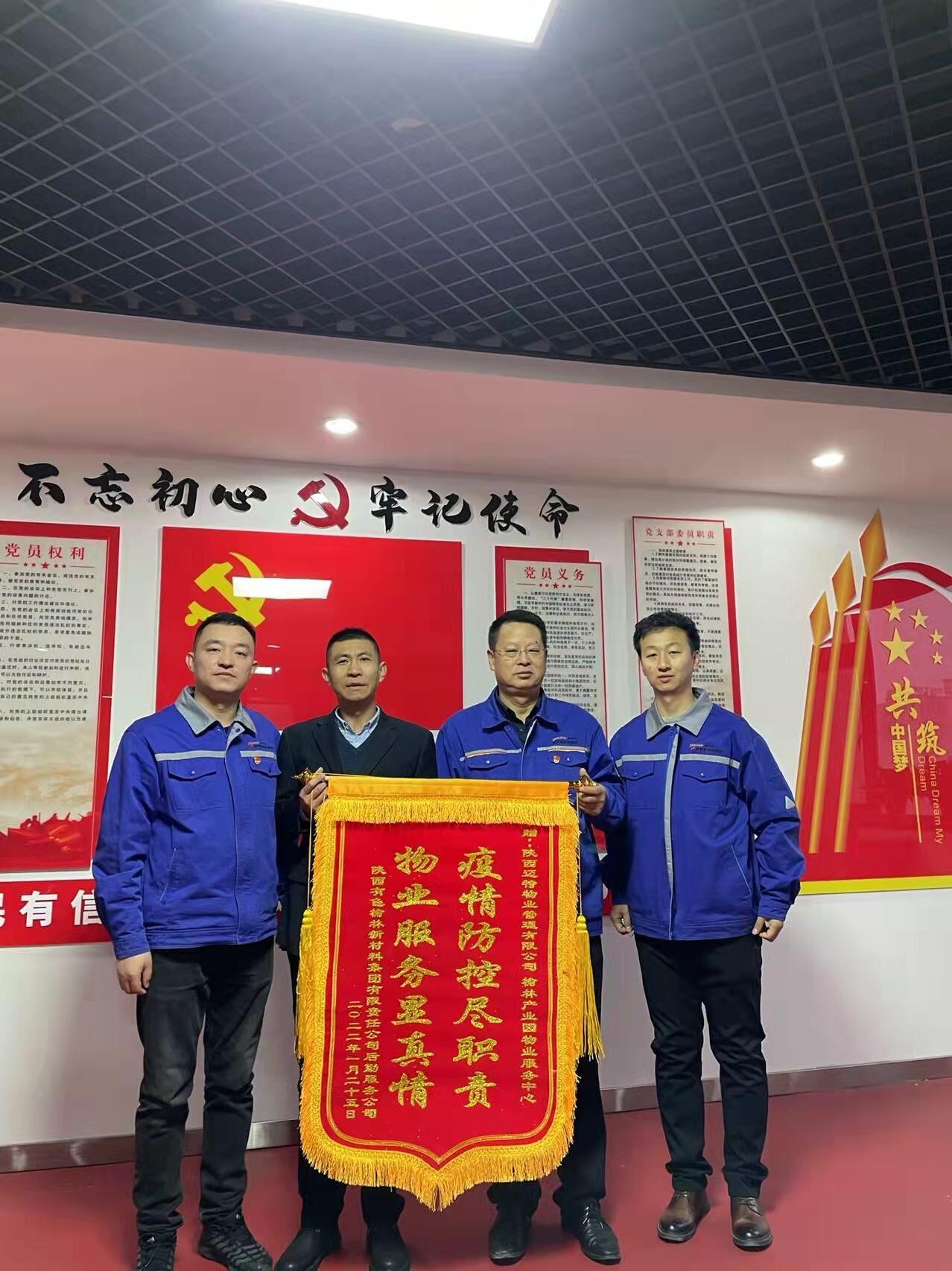 1月25日,陜西有色榆林新材料集團后勤服務公司在黨建會議室為西安實業邁特物業公司送來一面寫有“疫情防控盡職責 物業服務顯真情”的錦旗和一封表揚信,感謝邁特物業公司工作人員一年來細致入微,盡職盡責的貼心服務以及在抗疫期間的實干擔當。