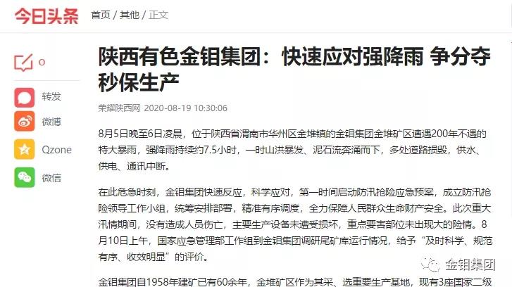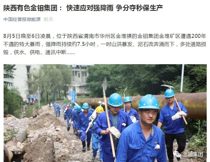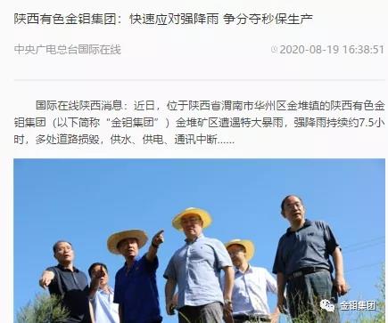 近日,經集團公司黨委宣傳部積極推薦,多家主流媒體相繼報道了《陜西有色金鉬集團:快速應對強降雨 爭分奪秒保生產》一文。包括環球網、中央廣電總臺國際在線、今日頭條網、中國經營報微能源均已收錄該文章。