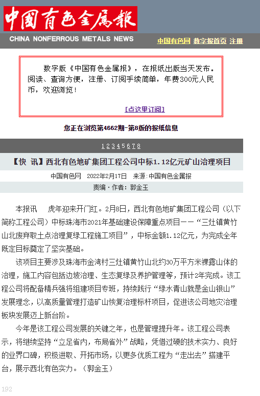 本報訊 虎年迎來開門紅。2月8日,西北有色地礦集團工程公司(以下簡稱工程公司)中標珠海市2021年基礎建設保障重點項目——“三灶鎮黃竹山北廢棄取土點治理復綠工程施工項目”,中標金額1.12億元,為完成全年既定目標奠定了堅實基礎。