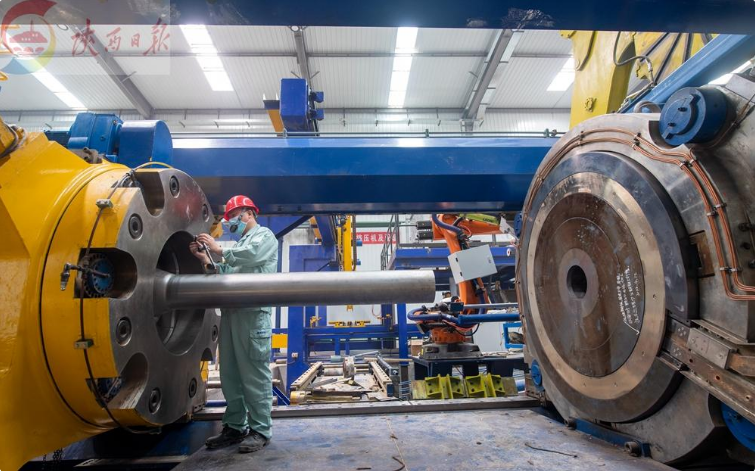 5月6日,在寶鈦集團(tuán)高品質(zhì)鈦錠、管材及型材生產(chǎn)線(xiàn)建設(shè)項(xiàng)目現(xiàn)場(chǎng),技術(shù)人員使用百分表安裝調(diào)試設(shè)備。