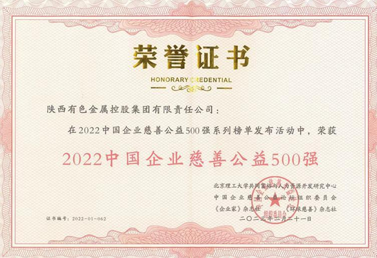近日,2022中國企業(yè)慈善公益500強發(fā)布暨第六屆中國企業(yè)慈善公益論壇在重慶涪陵舉行,陜西有色金屬集團(tuán)榮獲“2022中國企業(yè)慈善公益500強”榮譽稱號。