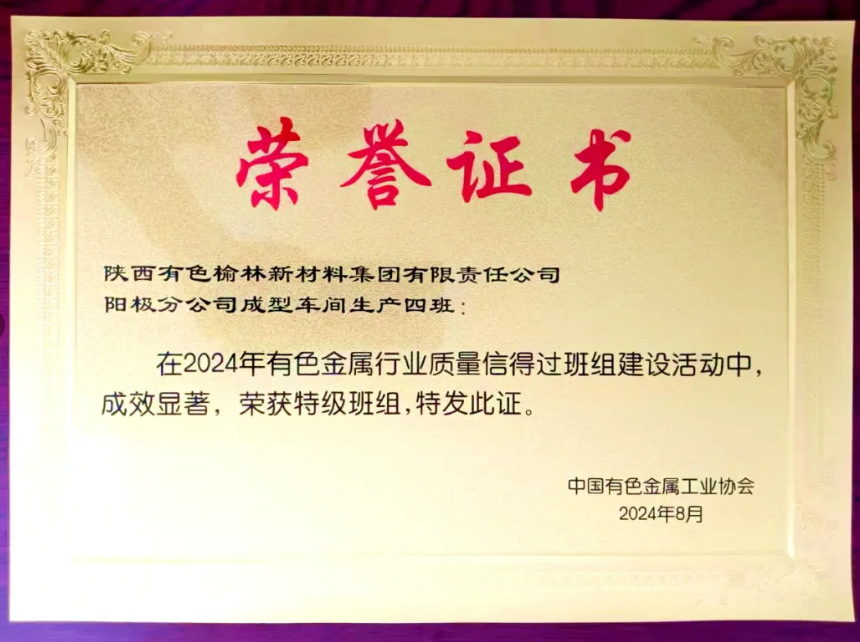 近日,2023—2024年度有色金屬行業(yè)優(yōu)秀質(zhì)量管理小組、質(zhì)量信得過(guò)班組等活動(dòng)評(píng)選結(jié)果揭曉,榆林新材料集團(tuán)陽(yáng)極分公司成型車間生產(chǎn)四班榮獲2023——2024年度有色金屬行業(yè)質(zhì)量信得過(guò)班組“特級(jí)班組”稱號(hào)。