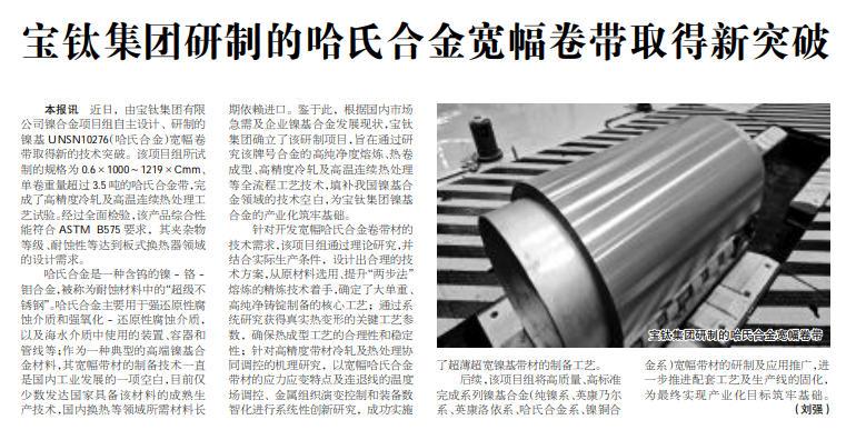 近日,由寶鈦集團鎳合金項目組自主設計、研制的鎳基UNSN10276(哈氏合金)寬幅卷帶取得新的技術突破。他們所試制的規格為0.6×1000~1219×Cmm、單卷重量超過3.5噸的哈氏合金帶,完成了高精度冷軋及高溫連續熱處理工藝試驗。經過全面檢驗,產品綜合性能符合ASTM B575要求,其夾雜物等級、耐蝕性、冷深沖壓型等達到板式換熱器領域的設計需求。