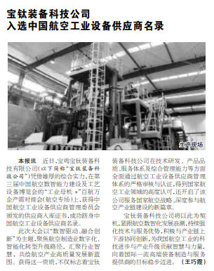 寶鈦裝備科技公司將以此為契機,緊跟航空數智化發展浪潮,持續強化技術與服務優勢,積極與產業鏈上下游協同創新,為我國航空工業的科技進步與產業升級貢獻智慧與力量,向著國際一流高端裝備制造與服務提供商的目標穩步邁進。