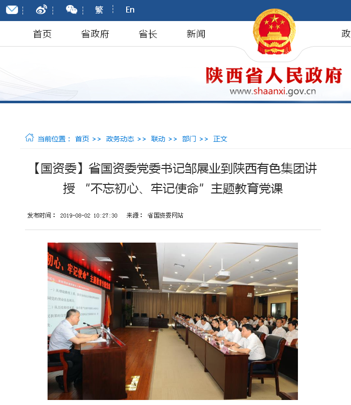 8月1日下午,根據(jù)中央、省委和省國資委黨委“不忘初心、牢記使命”主題教育部署,省國資委黨委書記鄒展業(yè)到陜西有色集團,以《悟初心、守初心、踐初心,以一流黨建推動省屬企業(yè)高質量發(fā)展》為題給黨員領導干部上了一堂內涵深刻、生動精彩的專題黨課。陜西有色集團黨委書記、董事長馬寶平主持黨課。