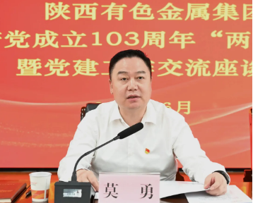 為慶祝中國共產黨成立103周年,弘揚偉大建黨精神,6月28日,陜西有色金屬集團召開慶祝中國共產黨成立103周年“兩優一先”表彰會議暨黨建工作交流座談會。集團公司黨委副書記、董事、總經理莫勇出席會議并講話,黨委副書記、董事、工會主席王小慶,省紀委監委駐陜西有色金屬集團紀檢監察組組長、黨委委員、紀委書記李金濤出席會議,黨委副書記郭仕龍主持會議。