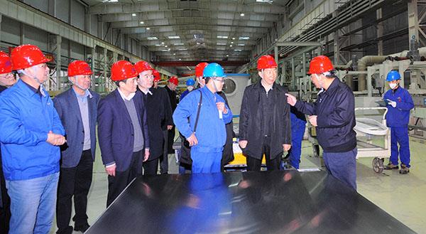 當天下午,趙剛一行來到位于西安高新區錦業一路的鉬金屬工業園,現場參觀考察鉬產業發展,與集團公司領導班子進行座談。在馬寶平、鄒武裝、程方方,金鉬股份總經理楊國平等人陪同下,趙剛首先參觀了公司鉬產業布局示意沙盤,走進金鉬股份展廳,聽取了馬寶平對公司概況、主要產品、發展成就介紹。隨后,他深入鉬粉分廠和板材事業部,仔細參觀、詢問了氧化鉬、鉬爐料及鉬板坯等鉬制品生產線的工藝流程、產品應用等情況,對公司在我國鉬行業取得的領先地位和作出的突出貢獻表示贊賞。
