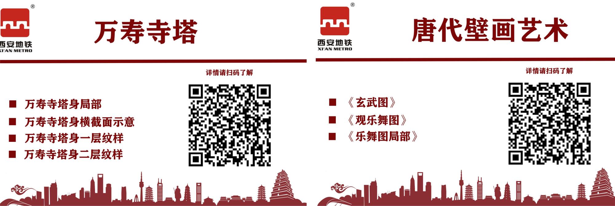 展區設在萬壽路站的兩條換乘通道內,展覽內容以萬壽路站周邊遺址考古發掘成果為對象,采用“磚雕復原”及“壁畫仿真復原”的方式,展示了“萬壽寺塔”和“唐代壁畫藝術”中的經典元素。精雕細琢的塔身紋樣、壁畫中雍容典雅的唐代仕女等歷史風采與現代城市風貌交相輝映,給乘客帶來了一場視覺與文化的雙重盛宴。此外,乘客還可以掃描現場二維碼進入“文物微展示”,免費查看文物與展覽詳情。