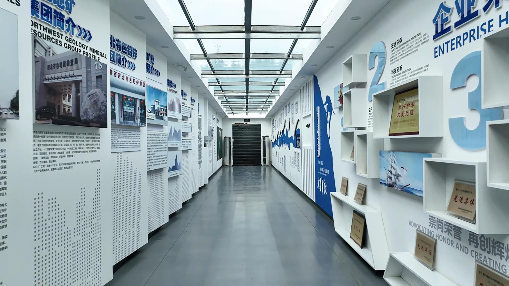 工程公司廊道文化充分吸收和融合了行業(yè)文化元素,“三光榮、四特別”地質(zhì)精神為廊道設(shè)計(jì)提供了豐富的靈感,一樓是企訓(xùn)宣傳欄,二樓分為企業(yè)愿景、價(jià)值觀、經(jīng)營理念、管理理念等8個(gè)模塊,三樓是人才理念和先進(jìn)人物事跡展,四樓是各產(chǎn)業(yè)板塊及重大典型工程案例,五樓是對(duì)文物保護(hù)特色產(chǎn)業(yè)的集中展示。每一塊展板都蘊(yùn)含著豐富的信息和深刻的啟示,方寸之間,文化盡顯。在森鑫礦業(yè)公司選礦廠二樓辦公區(qū),企業(yè)文化長廊的設(shè)計(jì)從礦山屬性出發(fā),以體現(xiàn)安全、專業(yè)、可靠的藍(lán)色為主色調(diào),各板塊使用了不規(guī)則圖形來表現(xiàn)內(nèi)容的個(gè)性化,避免了刻板的壓抑感,凸顯了公司積極向上的文化氛圍。同樣,在物化探總隊(duì)公司、研究院公司、717總隊(duì)公司、鉛鋅集團(tuán)本部和鳳縣分公司等單位,他們通過整合創(chuàng)新設(shè)計(jì),運(yùn)用每一塊展板、每一行文字、每一幅圖畫,把辦公區(qū)走廊、樓道、休息臺(tái)變成了回顧企業(yè)歷程、實(shí)施企務(wù)公開、展示技術(shù)成果、開展法治教育、宣介黨建品牌、倡導(dǎo)文明禮儀、弘揚(yáng)廉潔文化的藝術(shù)長廊。圖文并茂、靈活多樣的展陳形式,讓員工在駐足觀看學(xué)習(xí)的同時(shí),將企業(yè)文化理念內(nèi)化于心、外化于行。