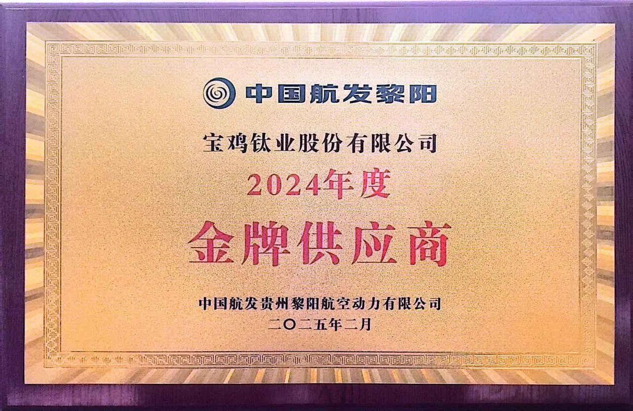 近日,在中國航發貴州黎陽航空動力有限公司(以下簡稱中國航發黎陽)2024年度供應商大會上,寶鈦股份憑借在鈦合金材料研發、生產交付及服務保障領域的卓越表現,從數百家供應商中脫穎而出,榮獲“2024年度金牌供應商”稱號。