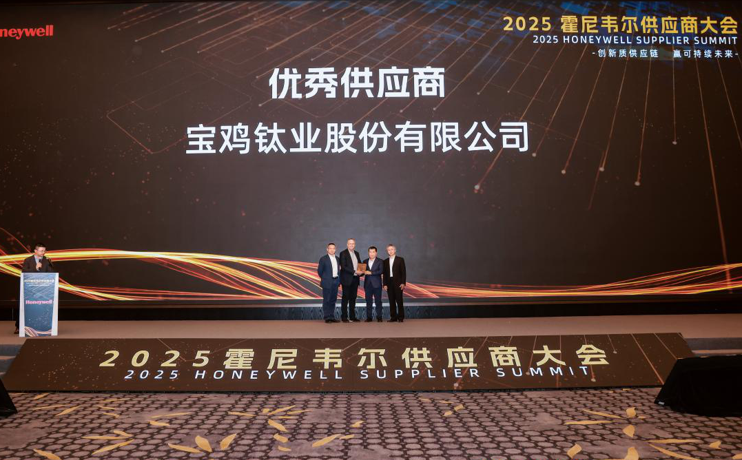 在今年2月底召開的2025霍尼韋爾中國區供應商大會上,寶鈦股份喜獲“優秀供應商”稱號。美國霍尼韋爾是一家享譽全球的高科技公司,其旗下的霍尼韋爾航空航天集團所提供的各類產品和服務,幾乎覆蓋了全球商用和航天飛機,在行業內具有廣泛而深遠的影響力。該榮譽既是對寶鈦產品、服務的高度認可,也是寶鈦拓展全球市場的一個縮影。