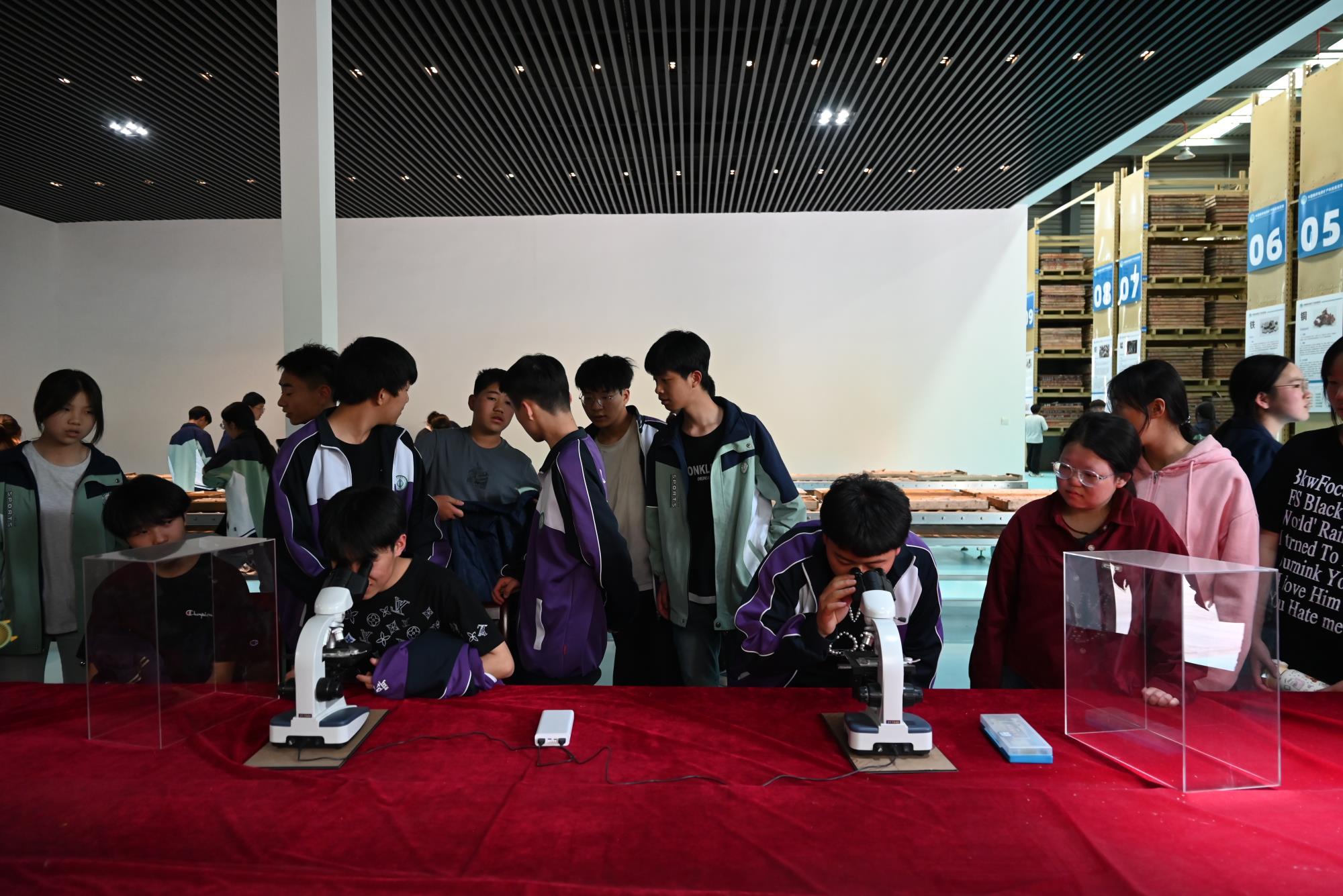 這座由地礦集團精心籌劃并投資修建的地質殿堂,猶如一把穿越時空的鑰匙,打開了孩子們通往神秘地質世界的大門。在寶藏世界展區,講解員生動地介紹了板塊運動塑造復雜地質構造的原理,并通過沙盤模型清晰地展示了秦嶺地區的山脈、峽谷和盆地的形成過程。礦產資源展區則化身自然寶庫,同學們認真聆聽了講解員對礦石種類、特征、用途及秦嶺地區礦產資源分布規律和形成原因的講解,還通過電子顯微鏡探秘礦石的微觀世界,依據顏色、光澤、形狀等特征來判斷礦石種類,在方寸之間觸摸大地的脈動。