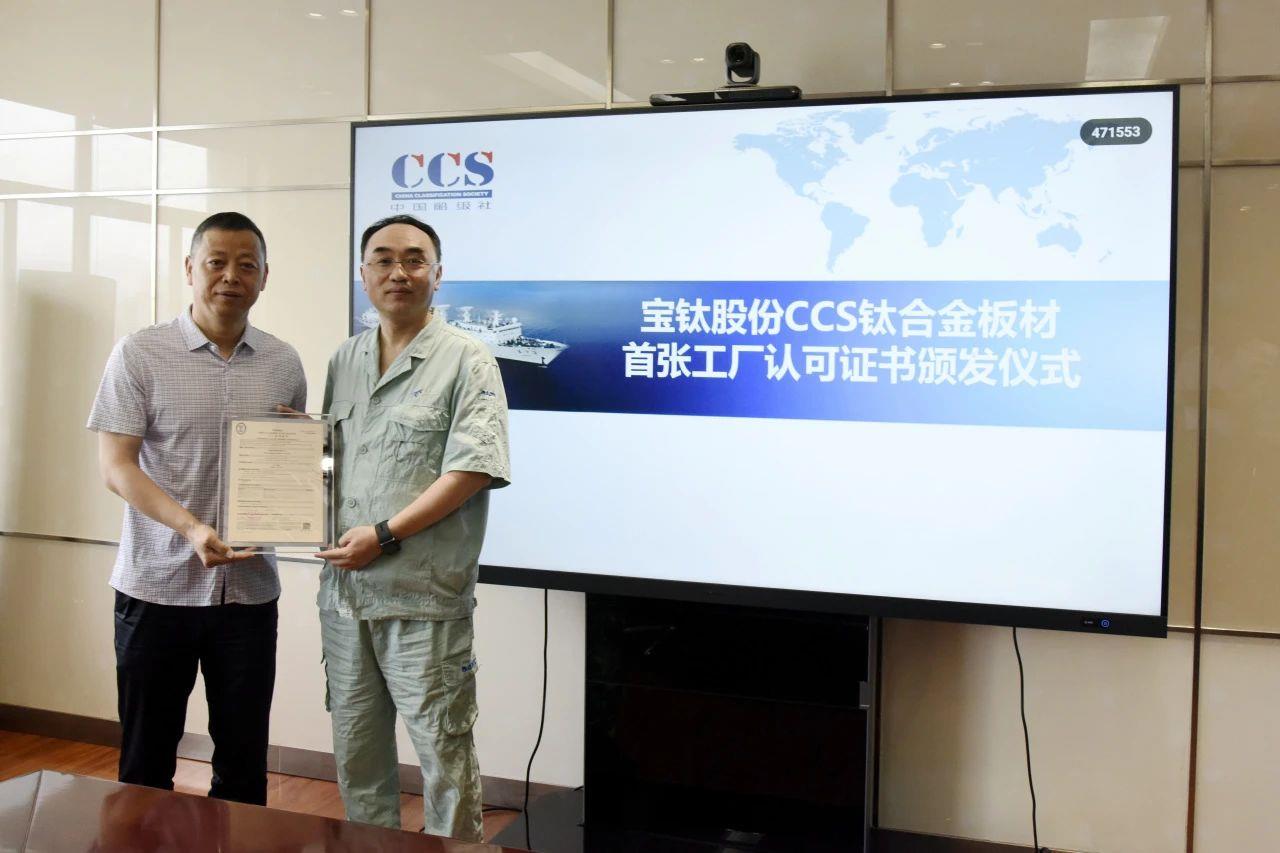 5月14日,中國船級社(CCS)鈦合金板材首張工廠認可證書頒發儀式在寶鈦股份舉行。寶鈦股份副總經理陳峰、CCS天津分社副總經理孫政策出席儀式,質量部主任馬勇軍主持儀式。