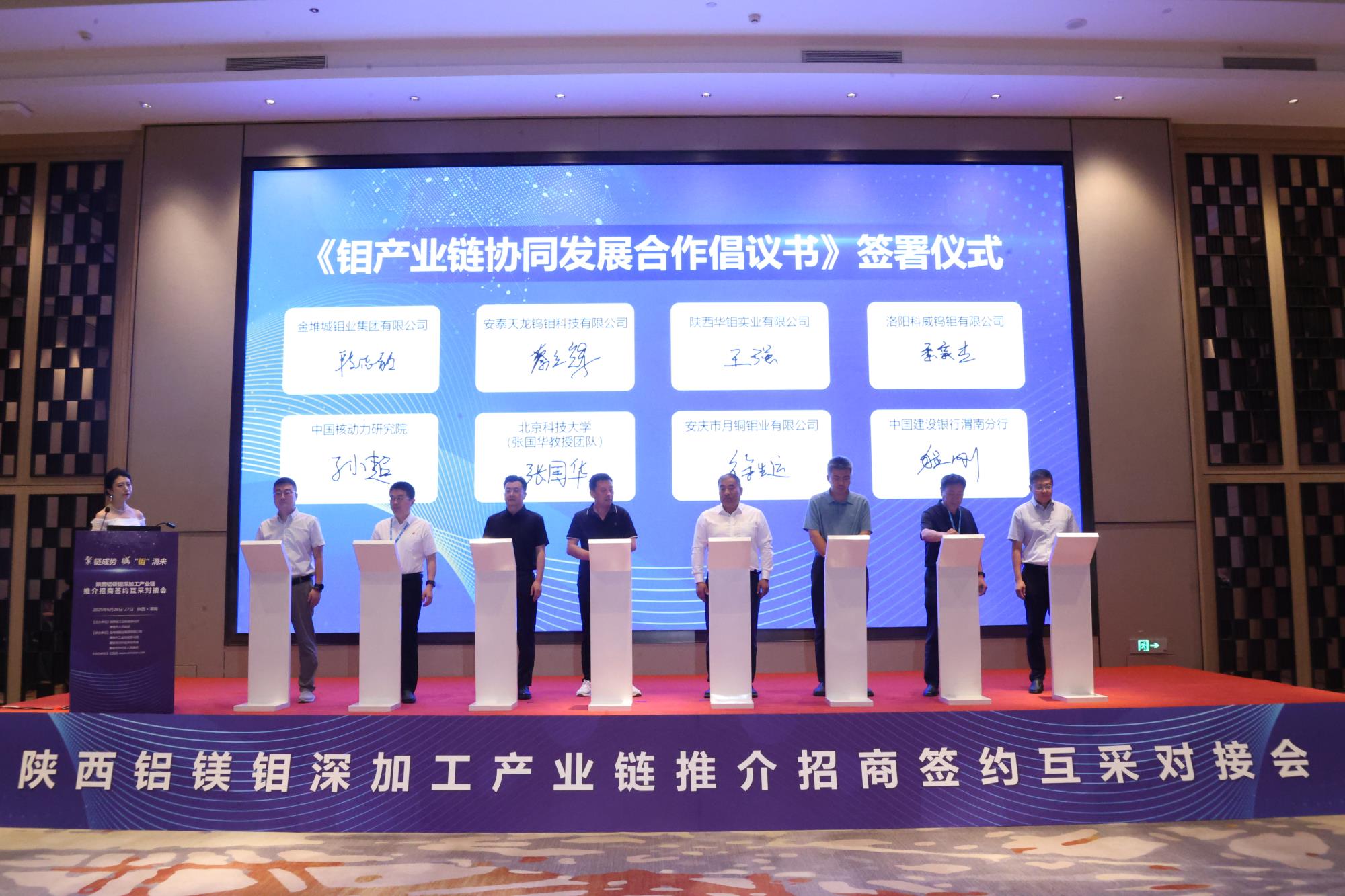 會上,渭南市華州區發布了鉬產業發展布局規劃,產業鏈相關合作銀行中國建設銀行陜西分行發布金融政策。由省鋁鎂鉬深加工產業鏈鏈主企業金鉬集團牽頭、聯合產業鏈上下游企業、科研院所、高校及金融機構共同發起簽署了《鉬產業鏈協同發展合作倡議書》。