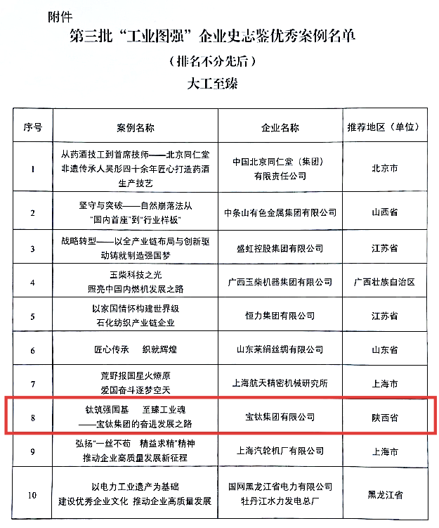 近日,寶鈦集團成功入選工信部工業文化發展中心第三批“工業圖強”企業史志鑒優秀案例名單。