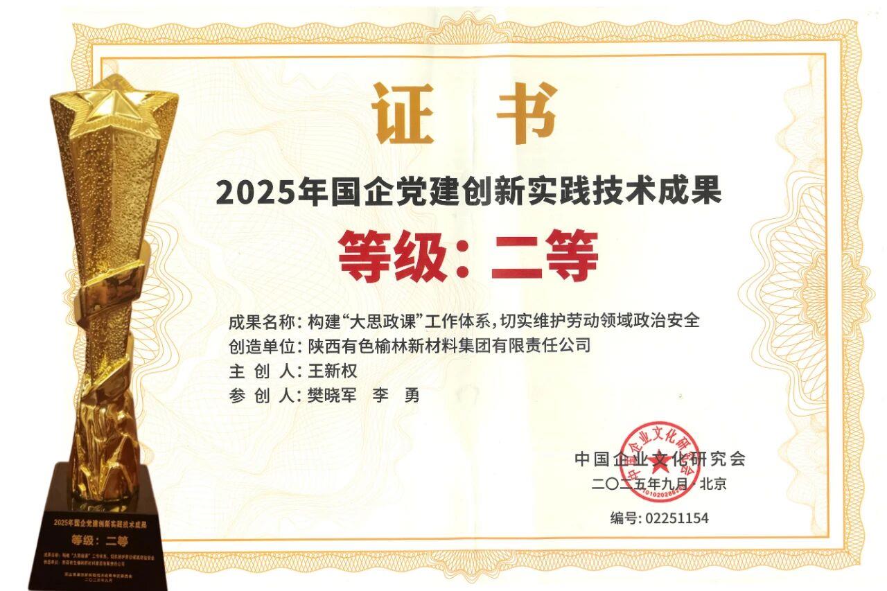近日,2025年國企黨建創(chuàng)新實(shí)踐交流會(huì)在北京召開。會(huì)上,公布了“2025年國企黨建創(chuàng)新實(shí)踐技術(shù)成果”評選結(jié)果。榆林新材料集團(tuán)黨委申報(bào)的黨建創(chuàng)新成果《構(gòu)建“大思政課”工作體系,切實(shí)維護(hù)勞動(dòng)領(lǐng)域政治安全》憑借突出的創(chuàng)建成效,獲評“2025年國企黨建創(chuàng)新實(shí)踐技術(shù)成果”第二等級。