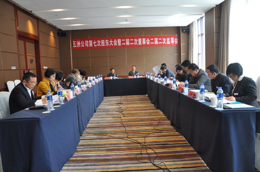 第七次股東大會(2014年年會)暨二屆二次董事會由集團公司副總經理、五洲礦業董事長李煒主持。會議審議通過了公司總經理艾軍代表公司做的《多措并舉、適應新常態,砥礪前行、實現公司持續穩健發展》工作報告和《2014年固定資產投資完成情況報告及2015年投資計劃》及《陜西五洲礦業股份有限公司“十三五”發展規劃(摘要)》;審議批準了財務部主任王春梅代表公司做的《2014年度財務決算及2015年度財務預算報告》;審議通過了李煒董事長做的《2014年度董事會工作報告》和公司監事會主席申占鑫做的《2014年度監事會工作報告》;審議通過了《關于陜西五洲釩金屬材料科技有限公司氮化釩生產線爐窯改造工程的議案》,原則通過《陜西五洲礦業股份有限公司關于建設100噸/年高純金屬釩項目的議案》,要求按照項目審批、建設和固定資產投資規定程序,推進有關工作。