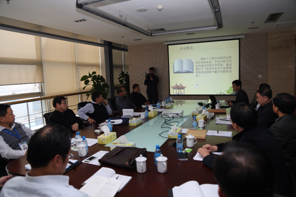 隨后,公司黨委宣傳部部長雷建軍作了黨的十八屆四中全會《決定》解讀,雷部長從四中全會概況、全面推進依法治國的意義目標原則、加強憲法實施、建設法治政府、保證公正司法、增強全民法治觀念、加強法治隊伍建設、加強黨對依法治國的領導、如何貫徹落實《決定》精神等方面,進行了言簡意賅、深入淺出的闡述和講解,使與會人員對四中全會精神有了更為系統(tǒng)和深入的把握。