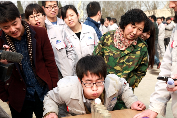 瞧,那里還有吹乒乓球的小游戲。桌面設8個水杯,將盛滿水的杯中放一個乒乓球,參賽者在30秒內將球從第一個水杯依次吹到最后一個水杯中,中途不得掉落,掉落者為失敗,獲勝者可獲獎品一份。