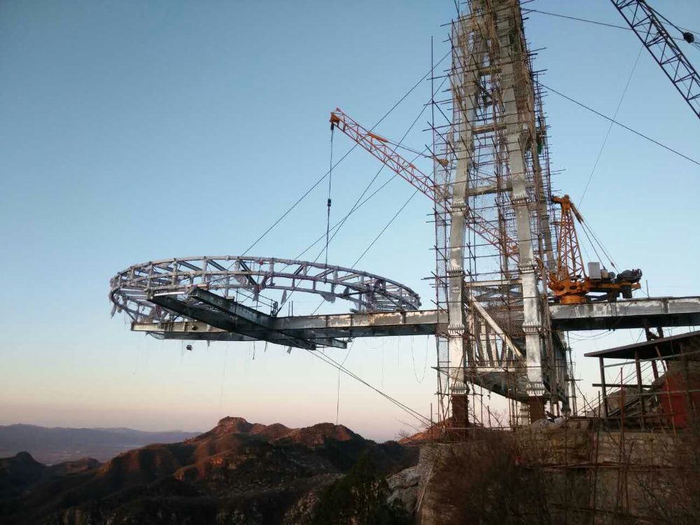 鈦合金觀景平臺為環狀,外圓直徑25.2米,內圓直徑為18米,整個平臺圓盤部分總高度為2.1米,分三層通過250×200×8鈦合金方管焊接成整體。鈦合金玻璃走廊結構采用H型鈦合金焊接梁組成,總長23米。