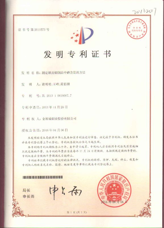 日前,金鉬集團《測定鉬及鉬制品中硒含量的方法》獲國家發明專利。這是該公司在分析檢測方面首次獲得的發明專利。