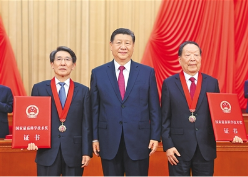 六月二十四日,全國科技大會、國家科學技術獎勵大會和中國科學院第二十一次院士大會、中國工程院第十七次院士大會在北京人民大會堂隆重召開。中共中央總書記、國家主席、中央軍委主席習近平向獲得二〇二三年度國家最高科學技術獎的武漢大學李德仁院士(右)和清華大學薛其坤院士(左)頒獎。