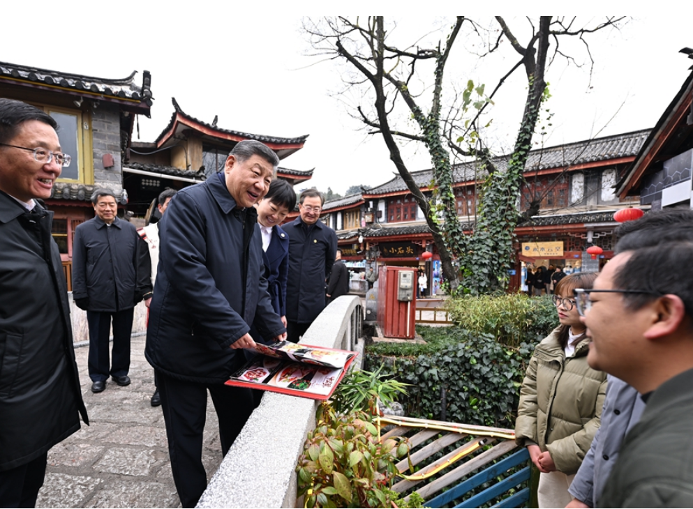 麗江古城有800多年歷史,被列入世界文化遺產名錄。一場春雪過后,麗江游人如織。習近平來到這里,詳細了解古城營建歷史、納西族民居特色和當地文化遺產保護利用、推動文旅融合發展等情況。居民和游客見到總書記十分興奮,爭相問好,有的還彈奏樂器、載歌載舞歡迎總書記。習近平頻頻與大家互動交流,了解商鋪經營狀況和游客感受。他要求當地處理好保護和發展的關系,讓這座美麗的古城煥發新的光彩。