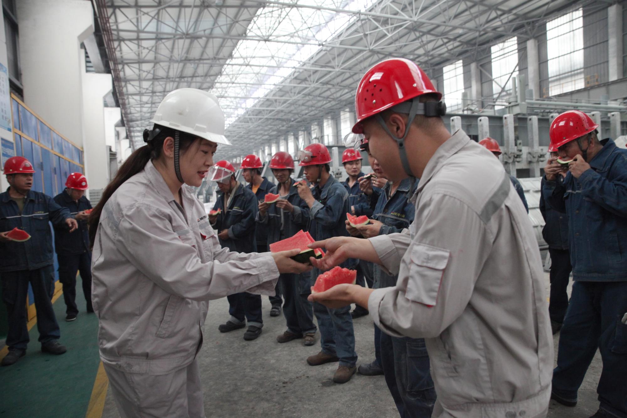 連日來驕陽似火,高溫天氣持續(xù)籠罩,陜西美鑫鋁鎂合金分公司生產一線一派繁忙景象,“奮戰(zhàn)二季度 實現(xiàn)雙過半”活動正如火如荼的進行著。陜西美鑫公司女工委積極響應公司黨政號召,6月14日下午,在鋁鎂合金分公司電解一、二車間開展“戰(zhàn)酷暑、保安全 與一線職工肩并肩”夏季送清涼活動,為奮戰(zhàn)在高溫一線的職工送去一絲清涼和一份關懷。