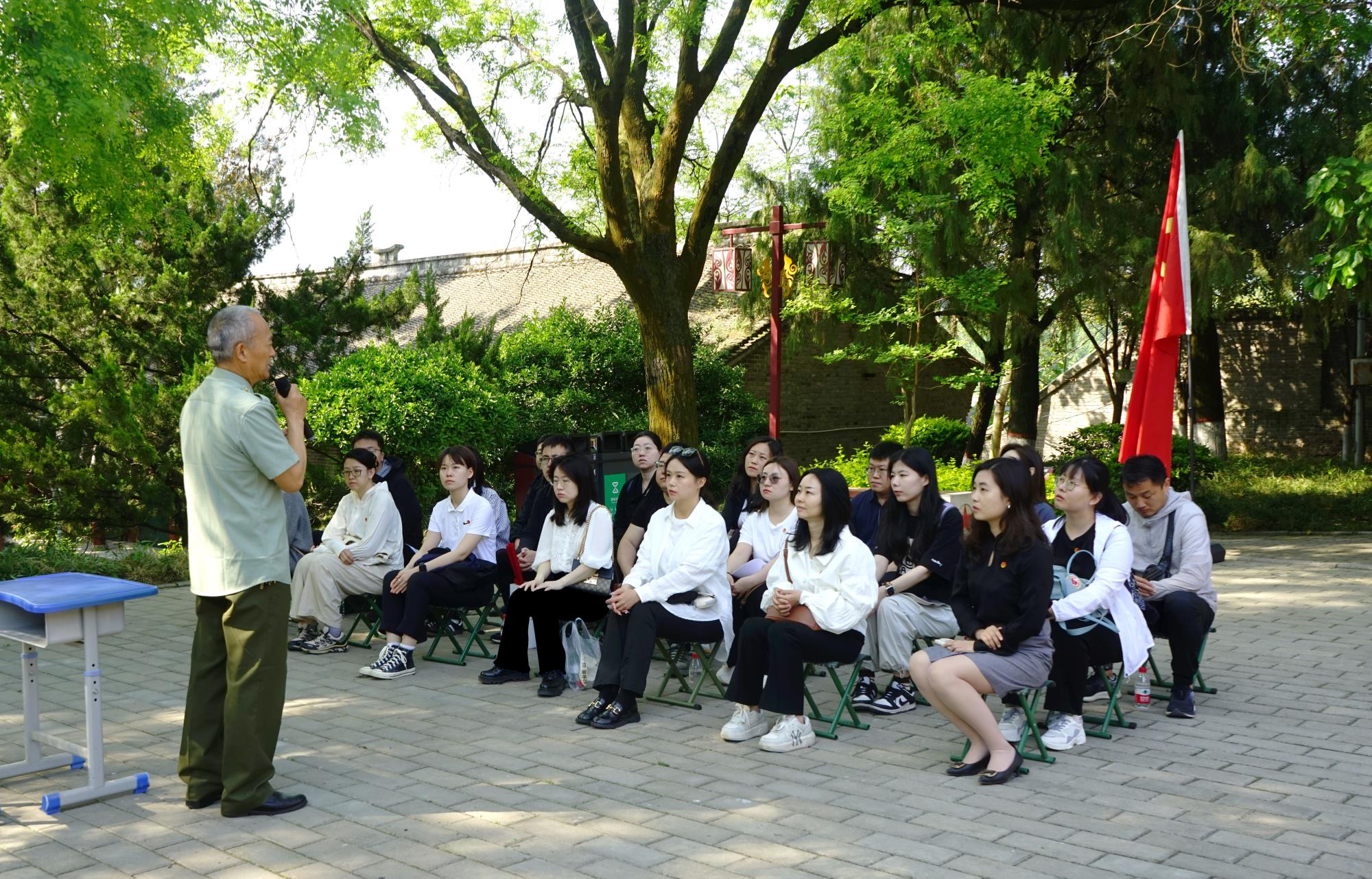 在起義舊址的大槐樹下,參加過中越邊境自衛反擊戰的老兵陳乾明老師為青年們授課,飽含感情的講述將大家帶回槍林彈雨的戰場,帶回硝煙四起的年代,也更讓青年們深切體悟到,我們習以為常的和平盛世,是千千萬萬保家衛國的戰士負重前行換來的,而青年的使命,正是不辜負犧牲、不辜負厚望,為中華民族的偉大復興接續奮斗。