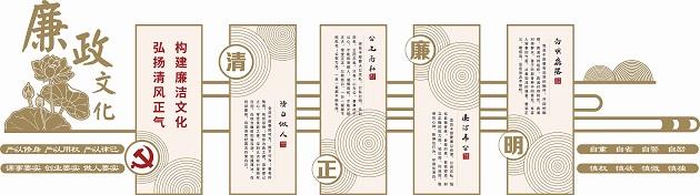 文化墻以“清、正、廉、明”為主題,以圣潔、高雅的荷花和純凈、靈動的祥云為設計背景,有著“出淤泥而不染”“拒腐蝕永不沾”的寓意;以圓形、方形為設計元素,象征著規范、法則、標準、界線,有著“無規矩不成方圓、有敬畏方知行止”的寓意;以金色為文化墻主色調,象征著堅定、純粹、高貴,有著“真金不怕火煉”“無懼磨礪考驗”的寓意。