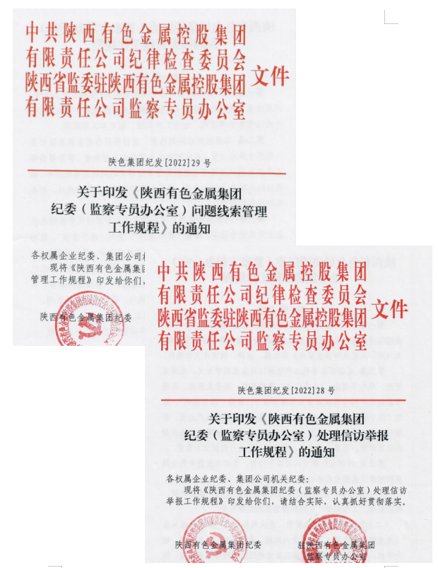 近日,陜西有色金屬集團紀委依據中央紀委印發的《紀檢監察機關問題線索管理辦法》等黨內法規,結合以往開展監督檢查審查調查工作經驗,分別研究制定并向權屬企業紀委下發了《信訪舉報工作規程》和《問題線索管理工作規程》(以下簡稱規程)。前者從信訪舉報的反映方式、受理、分類、分辦流轉、辦理要求、監督統計、綜合運用等方面明確了信訪件從受理到處置的全流程要求,后者從問題線索的甄別、篩選、流轉、處置、監督等方面對線索處置各環節職責任務進行了明確。