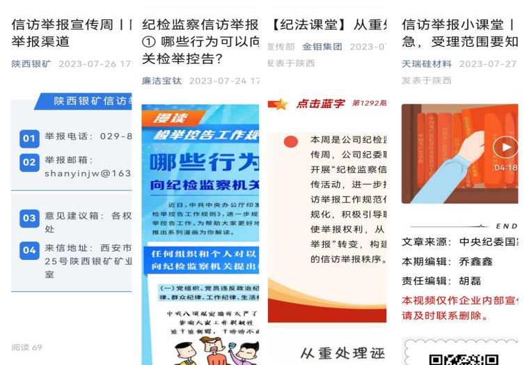 充分借助“線上”便捷優(yōu)勢(shì),在企業(yè)微信公眾號(hào)開(kāi)設(shè)“信訪舉報(bào)小課堂”專欄,對(duì)紀(jì)檢監(jiān)察信訪舉報(bào)受理事項(xiàng)、受理層級(jí)、舉報(bào)要素和舉報(bào)人權(quán)利義務(wù)等進(jìn)行詳細(xì)解讀。同時(shí),公布來(lái)信、來(lái)訪地址和電話、郵箱舉報(bào)方式等,暢通信訪舉報(bào)渠道,讓職工群眾時(shí)刻有地方舉報(bào),時(shí)刻能行使信訪舉報(bào)監(jiān)督的權(quán)力,使職工群眾監(jiān)督與黨內(nèi)監(jiān)督不斷貫通融合。
